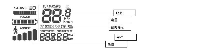 Function PAS Level;Speed;Trip/ODO;Headlight;Walk;Mile/KM;Error Alarm